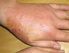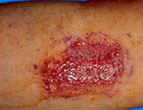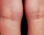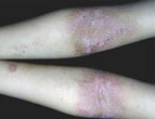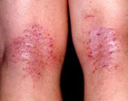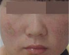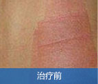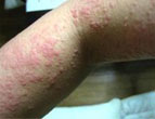 治疗前:阿明腿上、额头、手臂、背上的皮肤发红,增厚