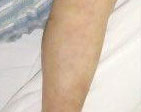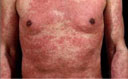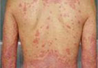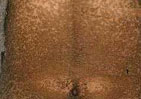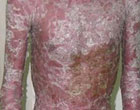 全身上下包括四肢、腹部、腰背等处皮肤都呈蛇皮鳞状,色泽黑褐, 粗糙龟裂,瘙痒难耐